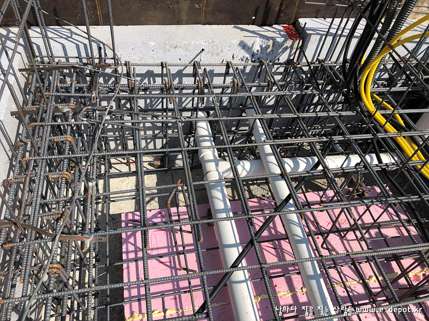 기초 전기배관사진입니다. 위생,급수 설비배관과 같이 철근배근작업과 병행하여 작업합니다.