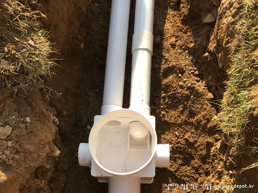 오수받이에 오수관과 하수관을 연결한 사진입니다.