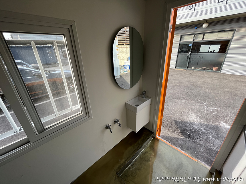 출입구 우측에 세면대와 막수전을 설치하고 출입문 좌측앞에서 부터 씽크대와 양변기 그리고 칸막이 뒤로 샤워기를 설치할 예정입니다.