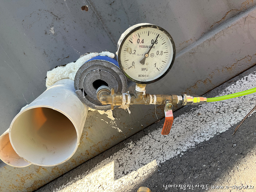 직접 수도를 연결해서 누수여부를 확인해보면 좋겠지만 여건이 안돼서 컴퓨레셔를 이용하여 공기압을 6k까지 주입하여 이상유무를 확인~!!