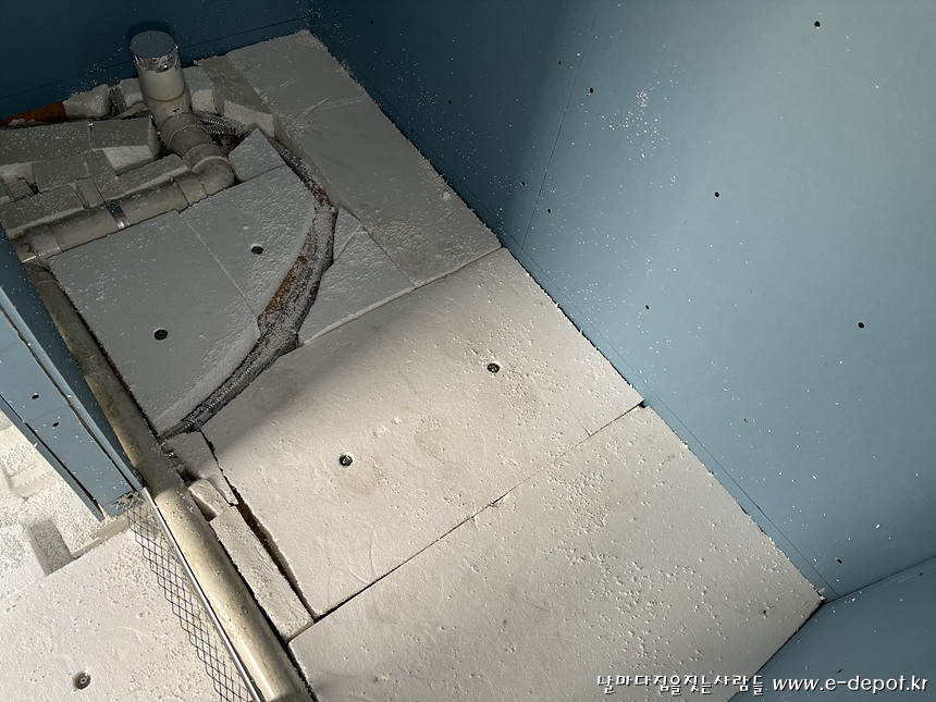 출입구 주변은 신발턱을 만들어 내부의 배관을 매립하고 단열재를 깔아 바닥 단열을 보강.