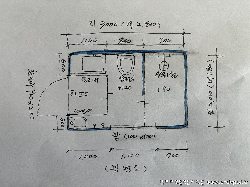 작업전에 간단하게 화장실 평면을 스케치 해 보았습니다.