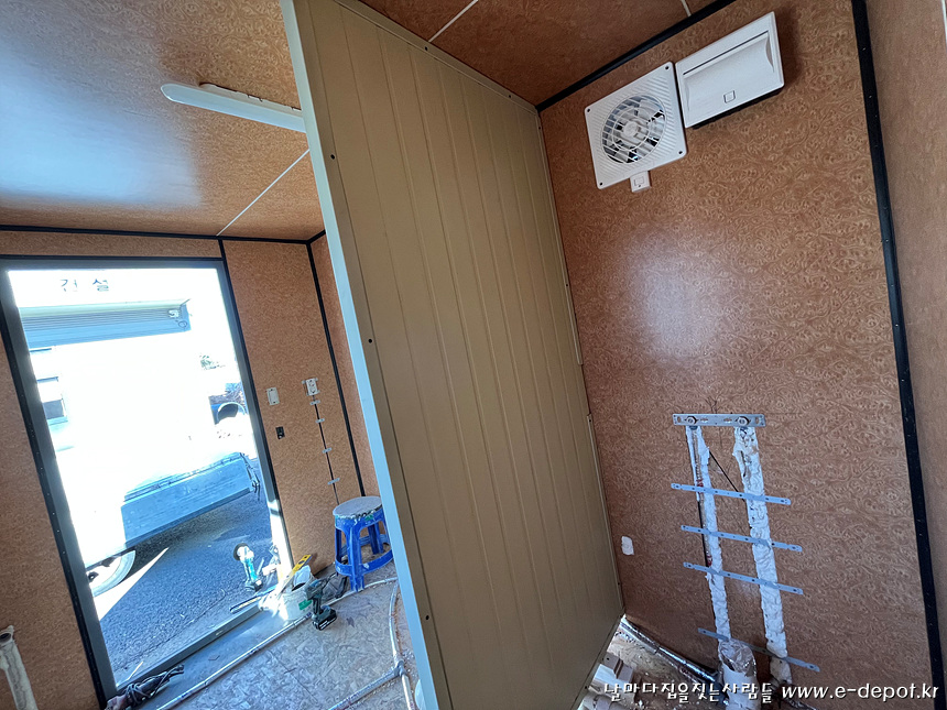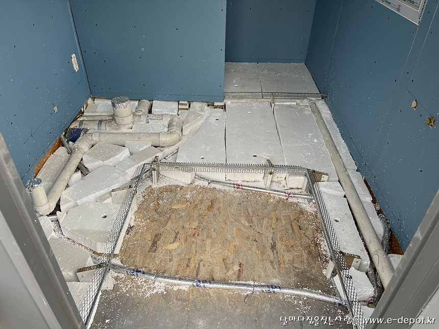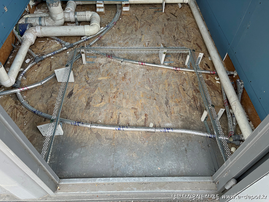 출입구 주변은 신발턱을 만들어 내부의 배관을 매립하고 단열재를 깔아 바닥 단열을 보강.