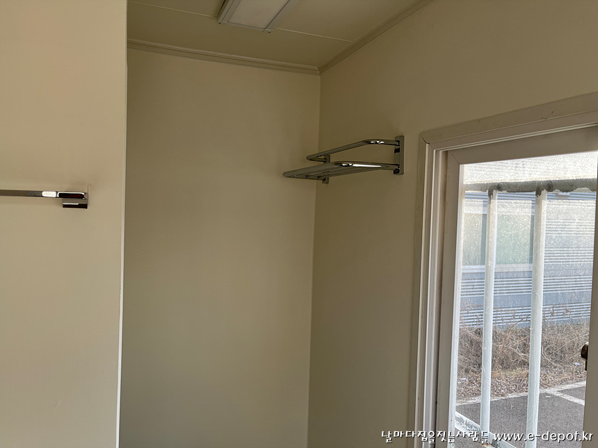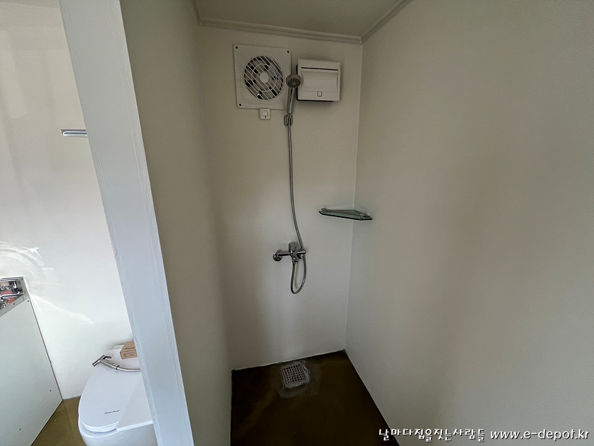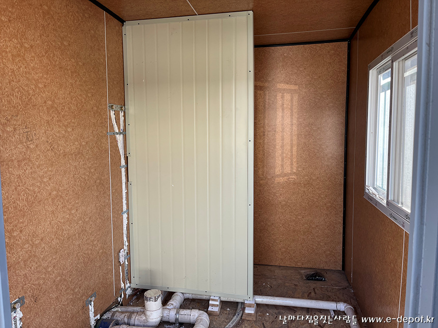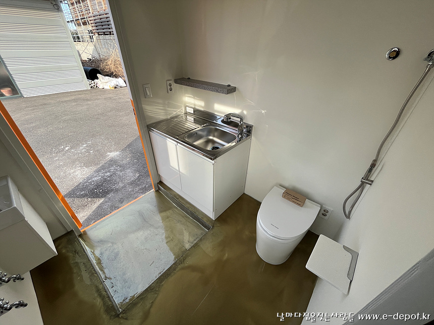 출입구 우측에 세면대와 막수전을 설치하고 출입문 좌측앞에서 부터 씽크대와 양변기 그리고 칸막이 뒤로 샤워기를 설치할 예정입니다.