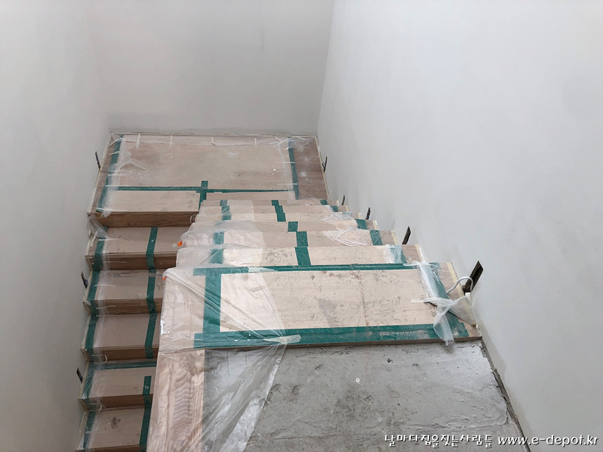 계단판 작업을 마무리 한 후 보양작업을 한 사진.