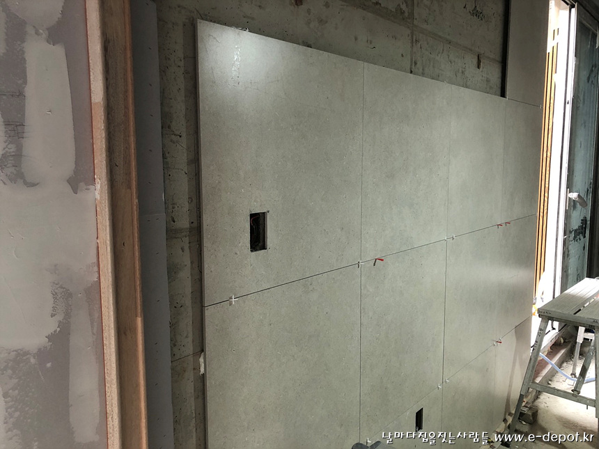 1층 홀과 거실단차부위 계단 타일시공사진.