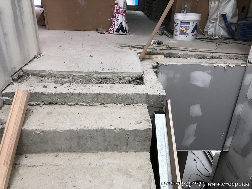 콘크리트 골조위에 목재계단 조성 사진.