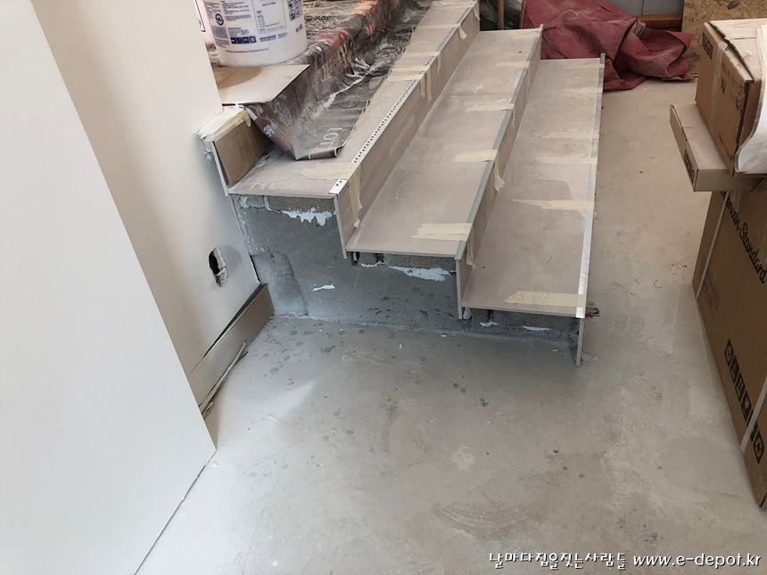 계단 코너부위는 졸리커팅하여 시공하였습니다. 졸리커팅 단점은 코너가 취약하여 파손되기 쉬우니 면치기할때 너무 얇아지지 않도록 하고 타일시공시 속채움을 기밀하게 하여 시공하도록 합니다.
