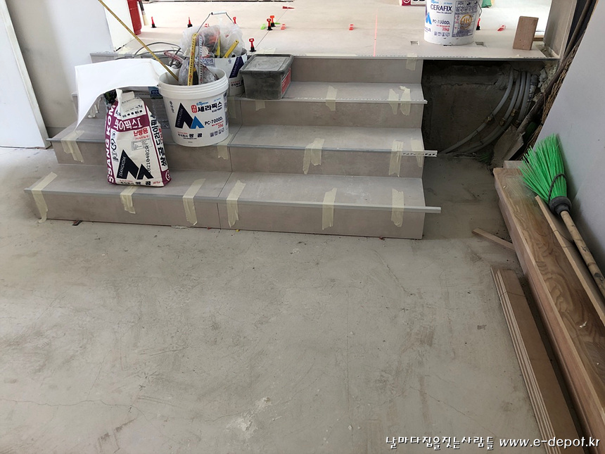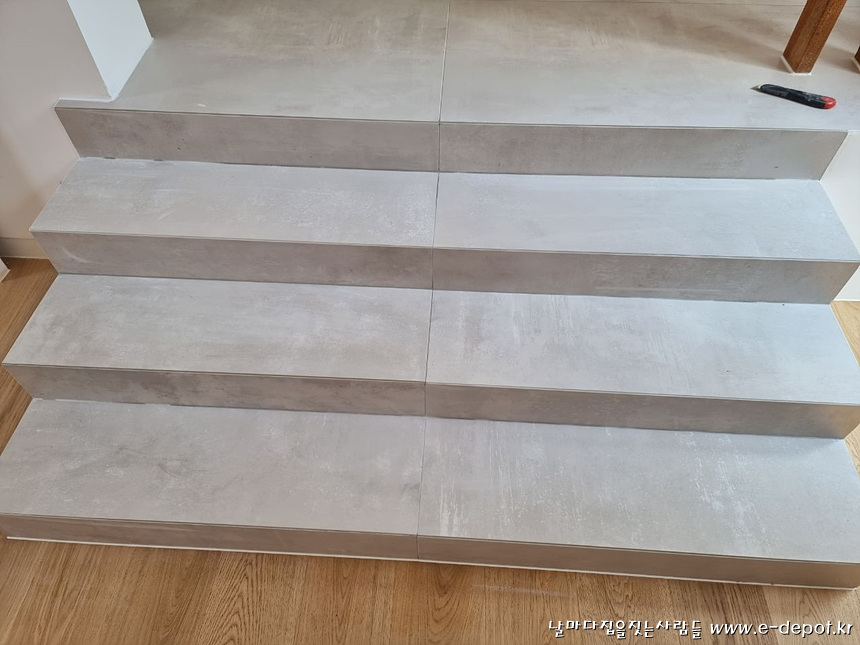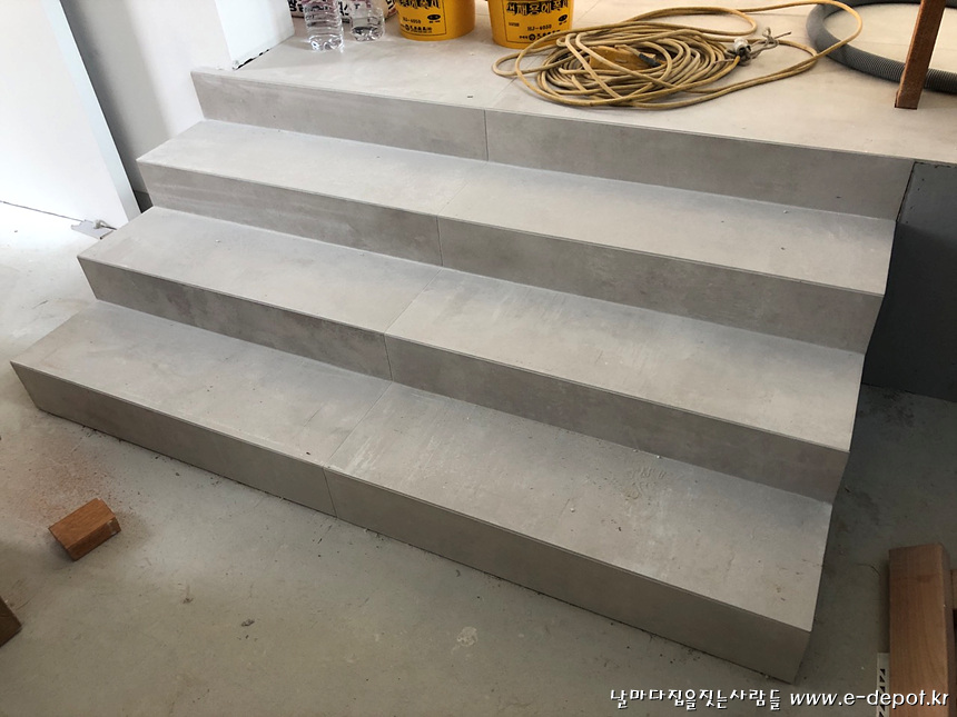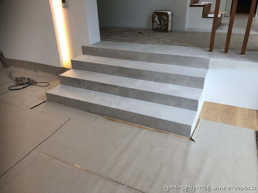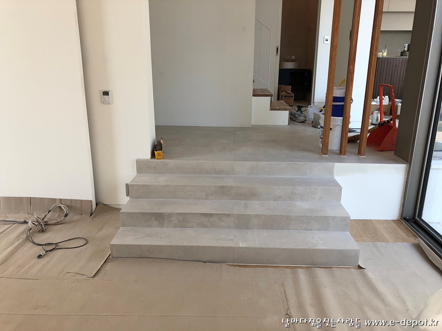 1층 홀과 거실단차부위 계단 타일시공사진.