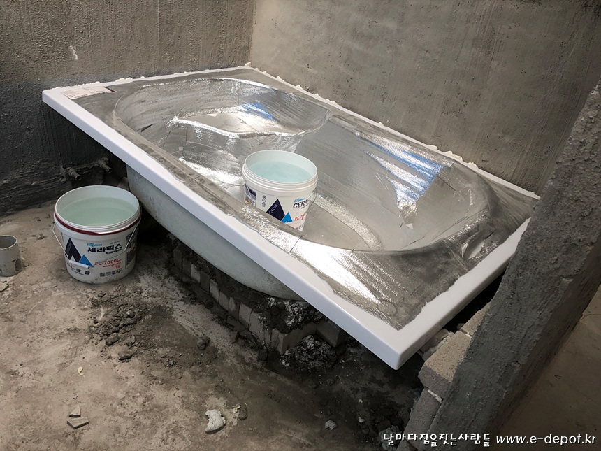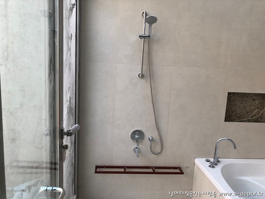 매립형 샤워기 설치 사진 및 하부선반 하지철물 시공 사진.