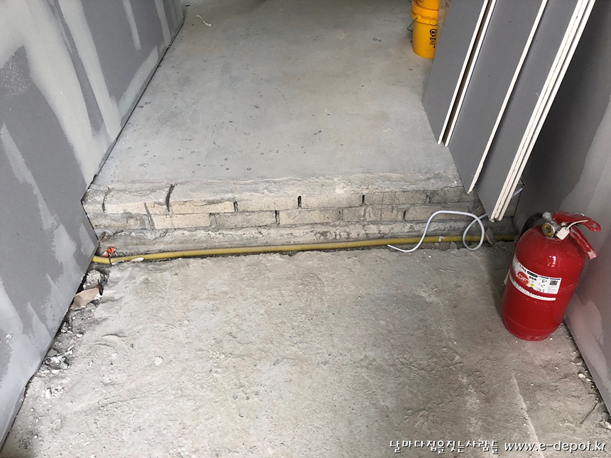 현관 턱 타일시공전과 타일시공 후 사진.