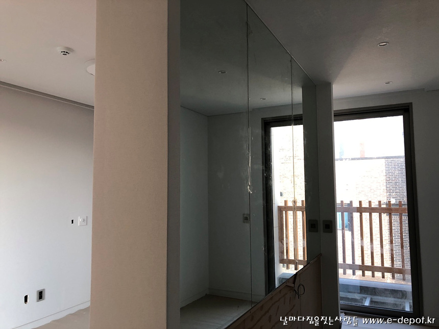 화장대 칸막이 벽 거울 시공 사진.