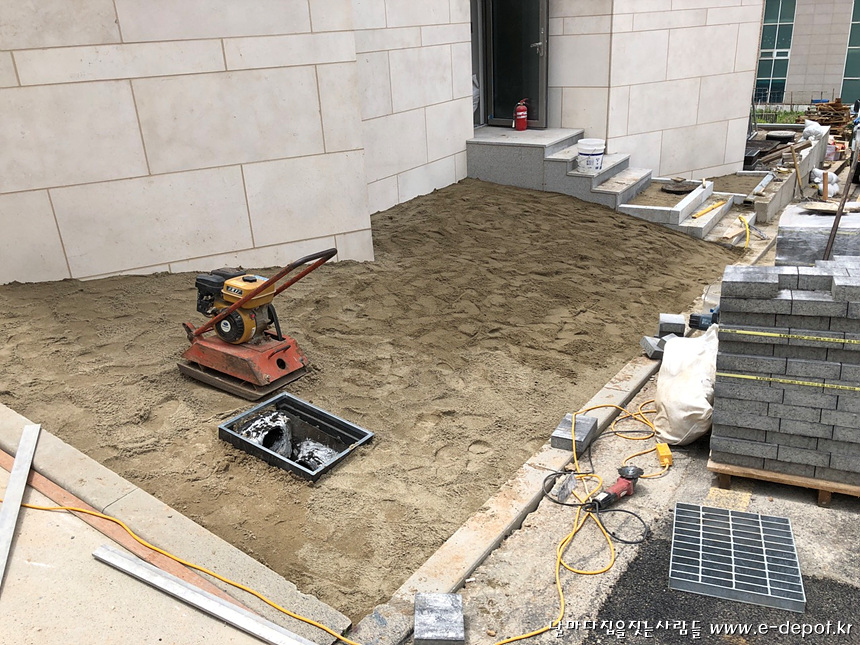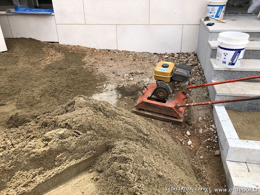 주차장 바닥에 투수블럭을 깔기 위한 모래 다짐 작업입니다.