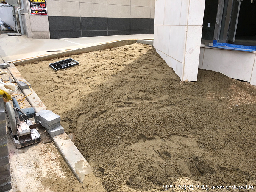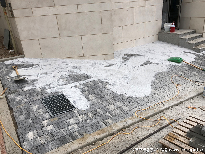 투수블럭 깔고 난 후 규사로 메지를 채워 넣습니다.