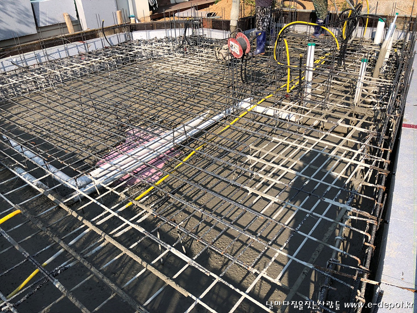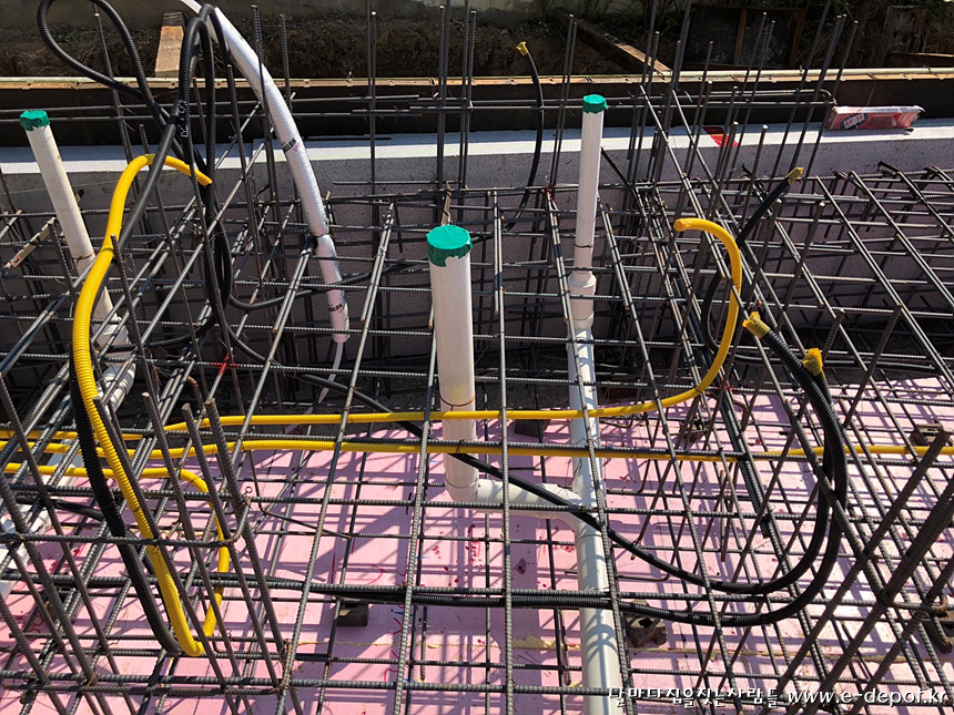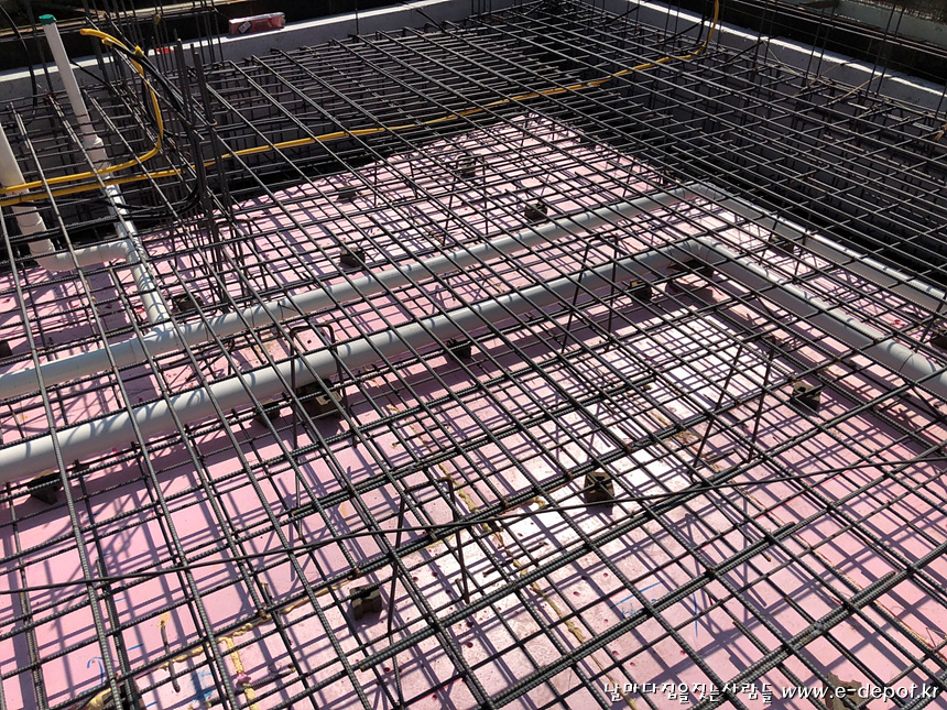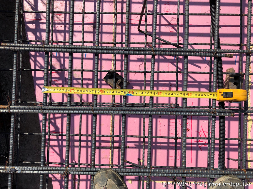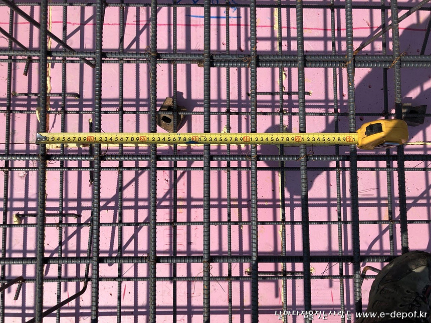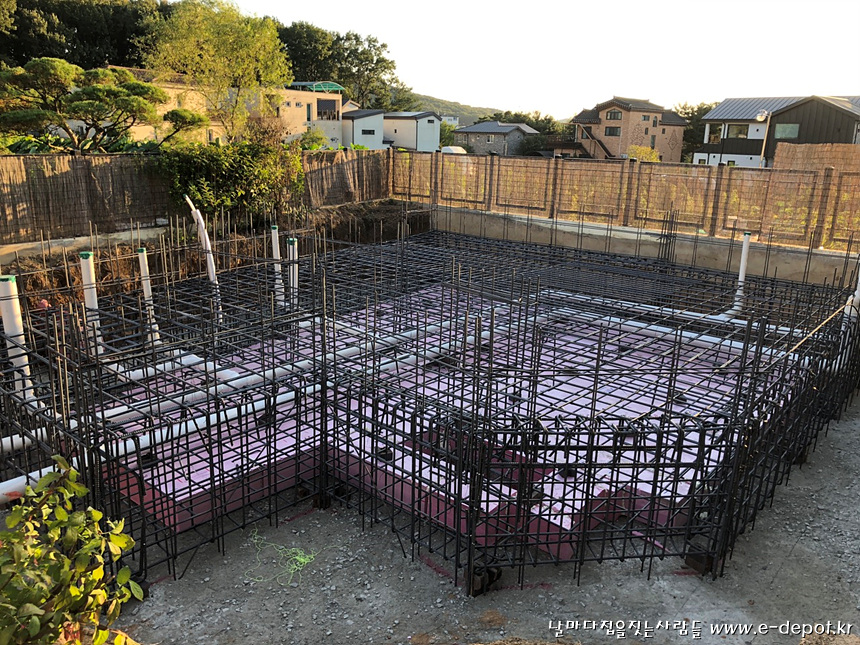 버림타설 후 기초 압출단열재 깔고 철근배근 사진.