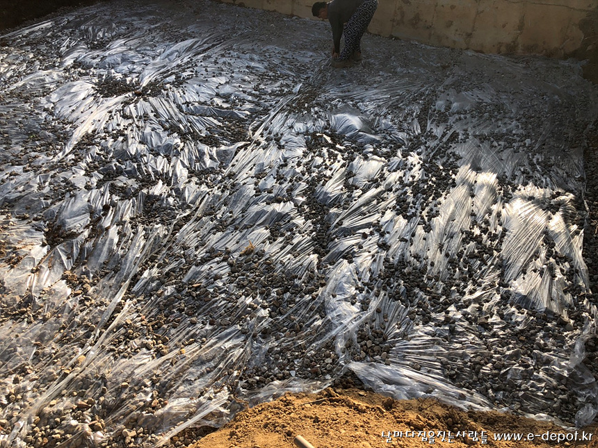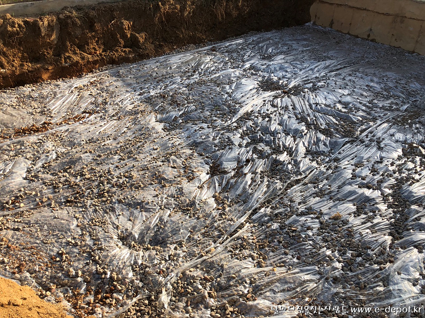 기초 터파기 후 잡석 지정후 필름 깔기.