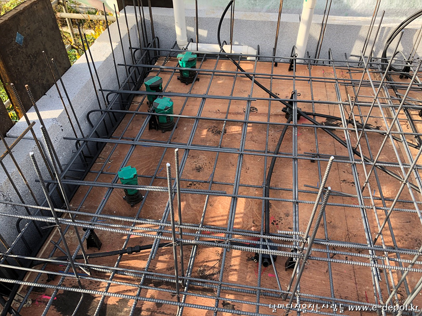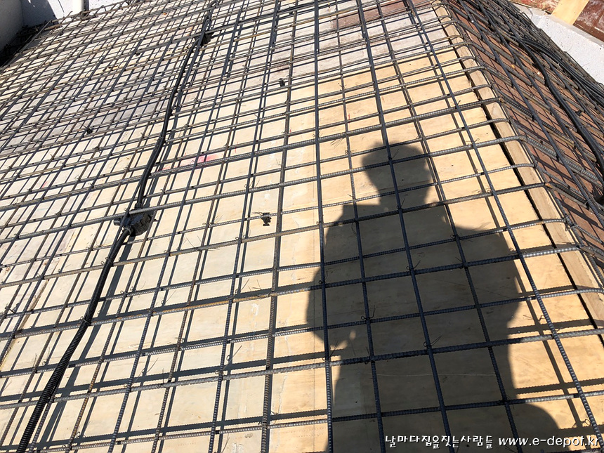 지붕층(최상층) 거푸집 설치 후 철근배근 사진.