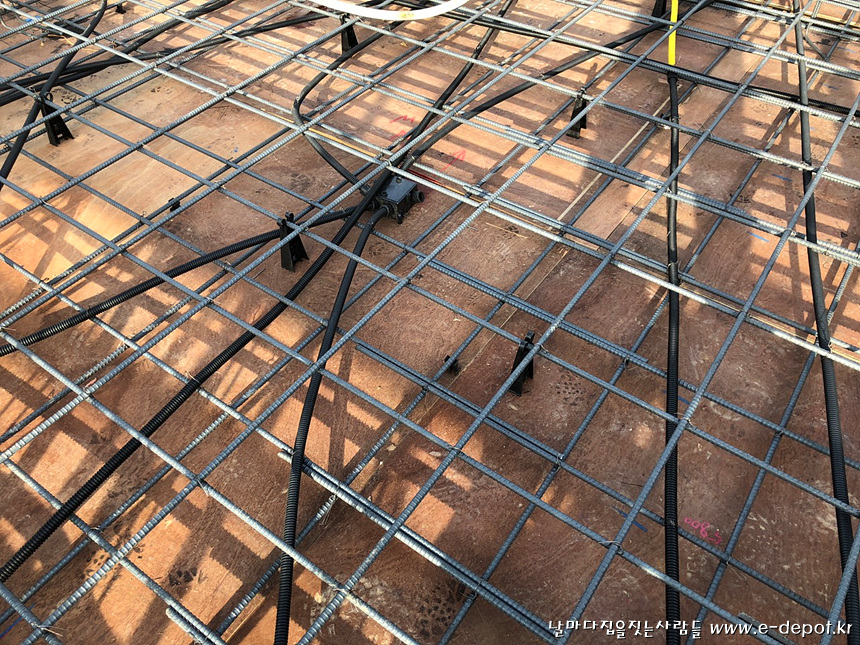 철근은 하부근을 먼저 배근하고 상부근을 배근하는 순으로 진행하며 구조 도면의 철근 배근 간격에 맞춰 시공하도록합니다.