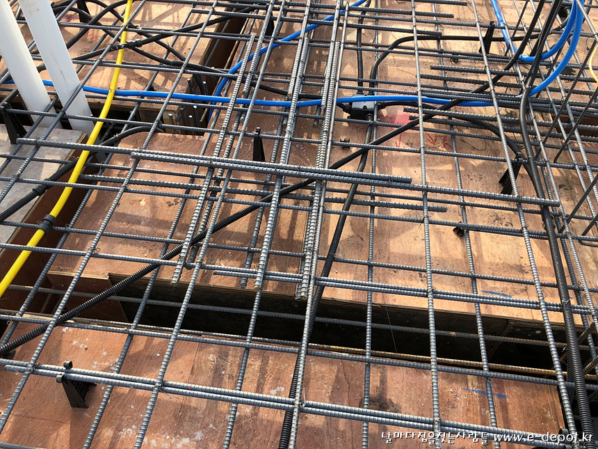철근은 하부근을 먼저 배근하고 상부근을 배근하는 순으로 진행하며 구조 도면의 철근 배근 간격에 맞춰 시공하도록합니다.