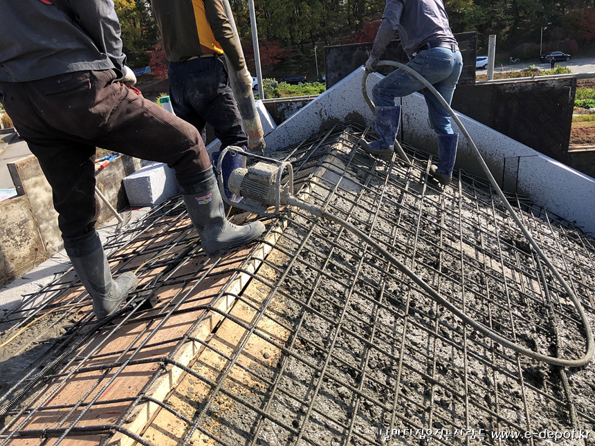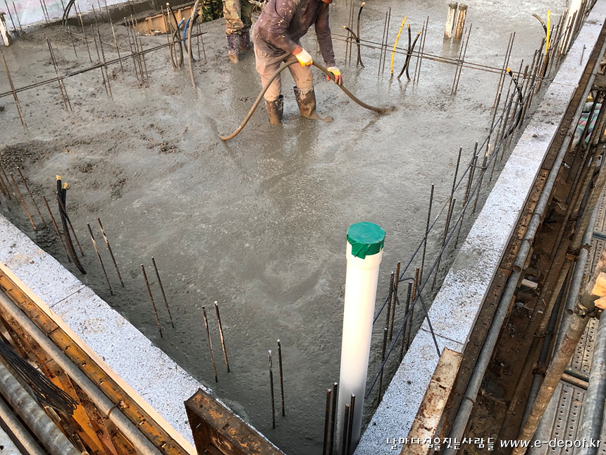 콘크리트 타설 시 바이브레더를 이용하여 시멘트와 자갈이 재료 분리되지 않도록 합니다.