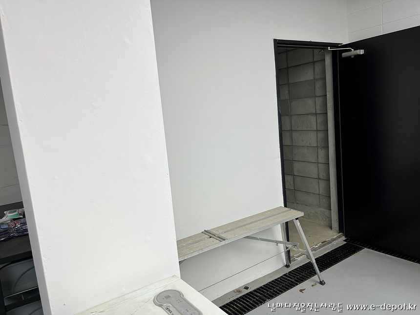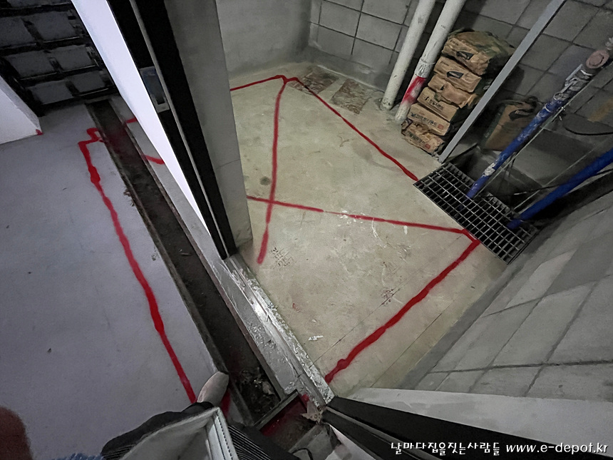 지하실 창고로 사용하던 위치에 엘리베이터를 설치할 계획으로 적색 스프레이 표시위치가 엘리베이터 PIT가 들어설 곳으로 칸막이벽을 철거하고 바닥을 터파기하는 작업을 진행하도록 해야 합니다.