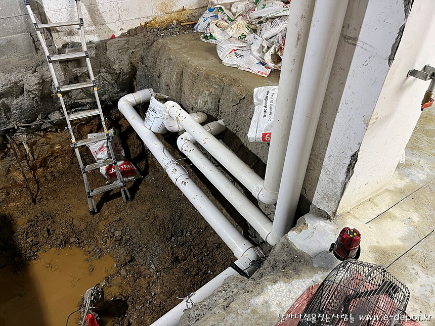 기존 위생배관이 엘리베이터 PIT층이 조성될 곳을 가로질러 있어 기존 배관을 제거 한후 엘리베이터 PIT층을 우회하여 새로 설치하였습니다.