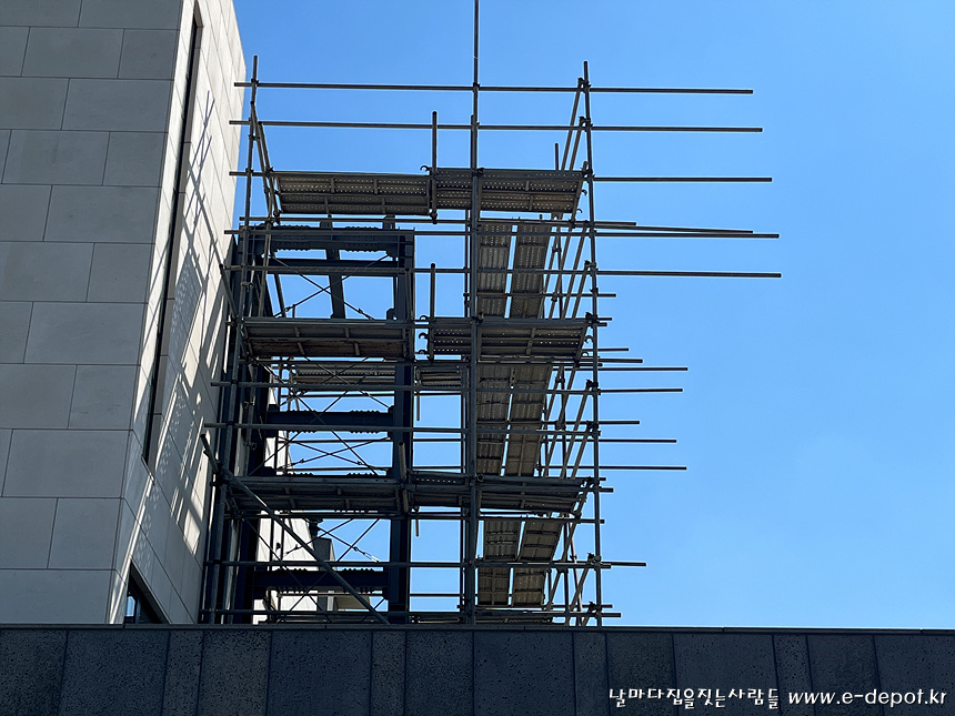 엘리베이터실 철골설치작업이 마무리 되면 다음 공정에 대비하여 비계설치작업을 합니다.