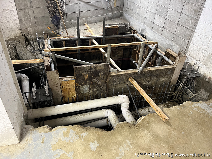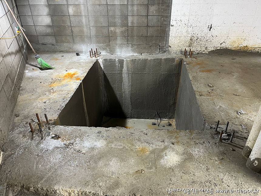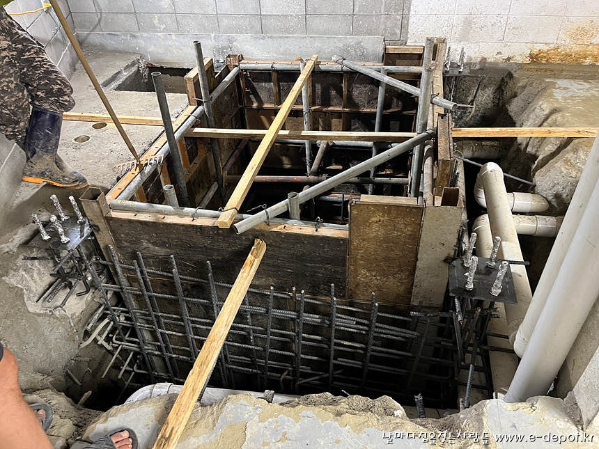 엘리베이터 PIT층이 건조한 땅이라 지하수 및 건수가 발생하지 않았는데 스라브 절개를 한 후 비가 자주 오다보니 엘리베이터 PIT층에 빗물이 가득차서 수시로 수중펌푸를 이용하여 펌핑작업을 하였습니다.