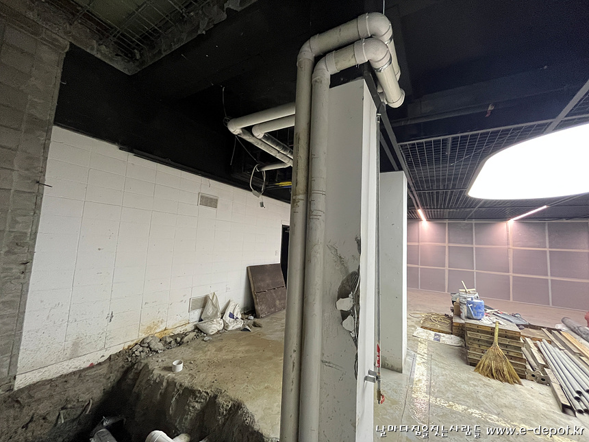 기존 위생배관이 엘리베이터 PIT층이 조성될 곳을 가로질러 있어 기존 배관을 제거 한후 엘리베이터 PIT층을 우회하여 새로 설치하였습니다.