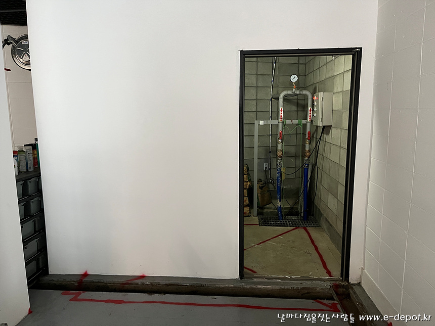 지하실 창고로 사용하던 위치에 엘리베이터를 설치할 계획으로 적색 스프레이 표시위치가 엘리베이터 PIT가 들어설 곳으로 칸막이벽을 철거하고 바닥을 터파기하는 작업을 진행하도록 해야 합니다.