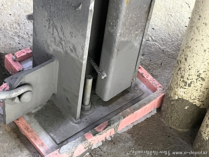 PIT층 철골 접합부위 무수축몰탈 타설 사진입니다.