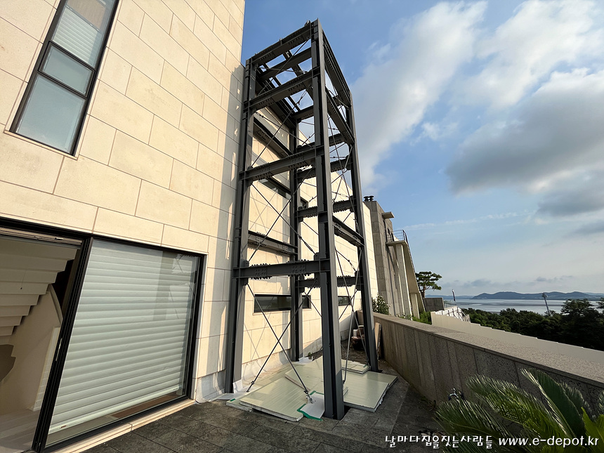 엘리베이터실 철 구조물은 공장에서 제작하여 현장에 반입했습니다.