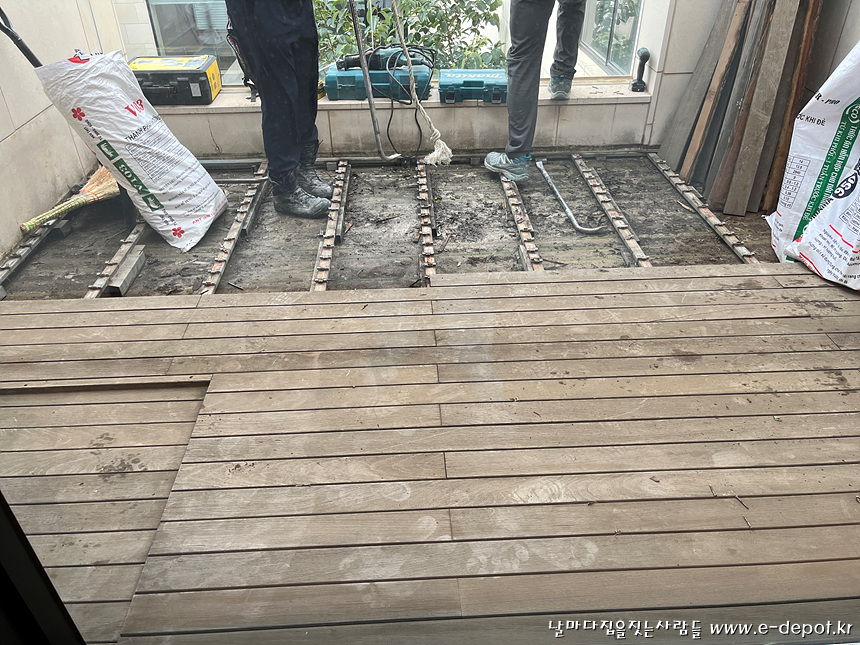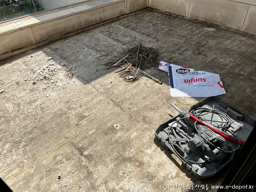 목재 데크를 철거 한 후 누름콘크리트를 파쇄하여 철거 한 후 기존 구체 콘크리트 위에 방수작업을 진행할 예정입니다.