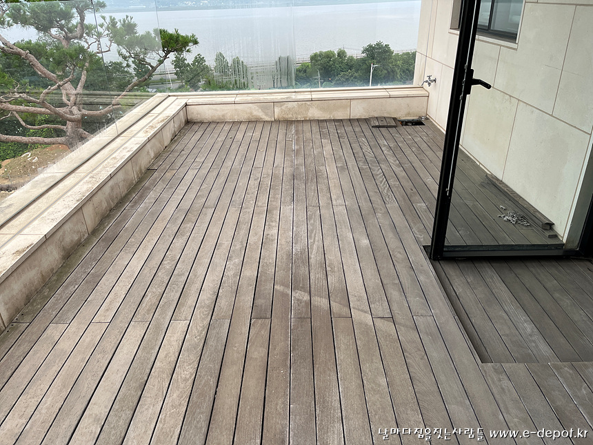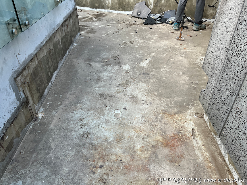 목재 데크를 철거 한 후 누름콘크리트를 파쇄하여 철거 한 후 기존 구체 콘크리트 위에 방수작업을 진행할 예정입니다.