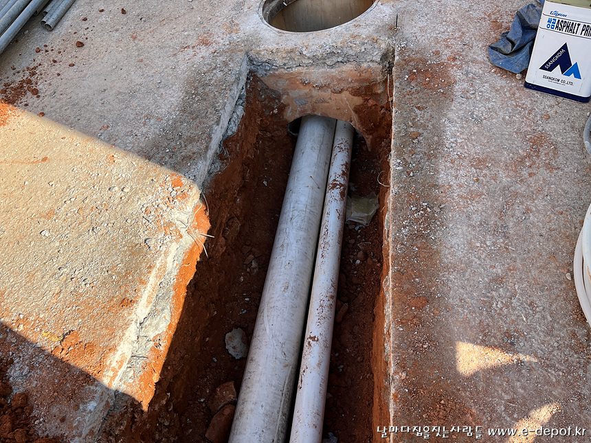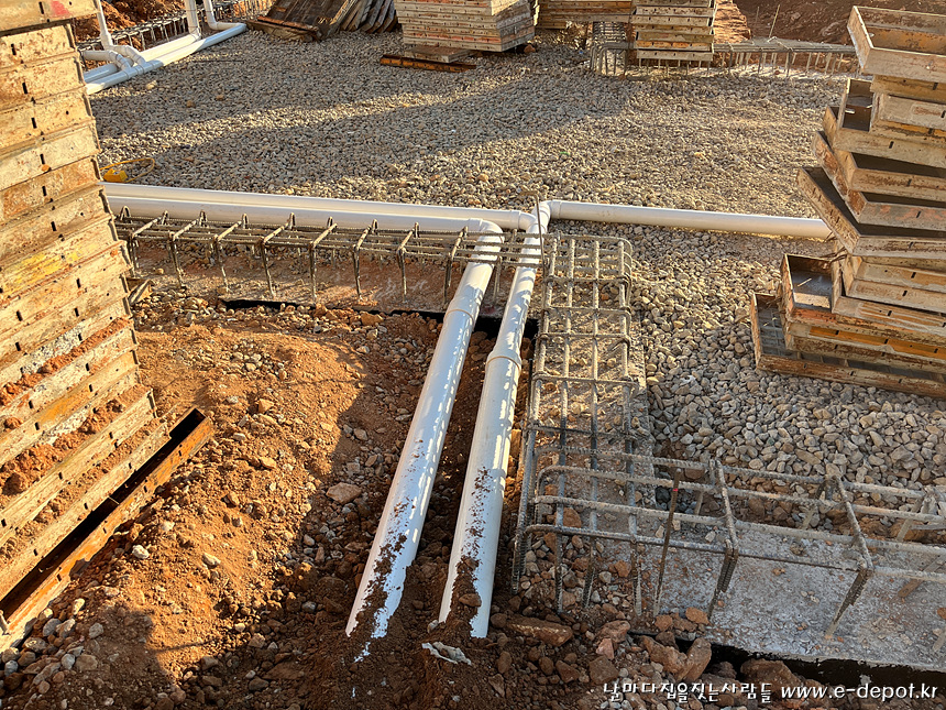 파주전원주택시공 : 기초바닥 콘크리트 타설 후 외부배관 및 되메우기공사