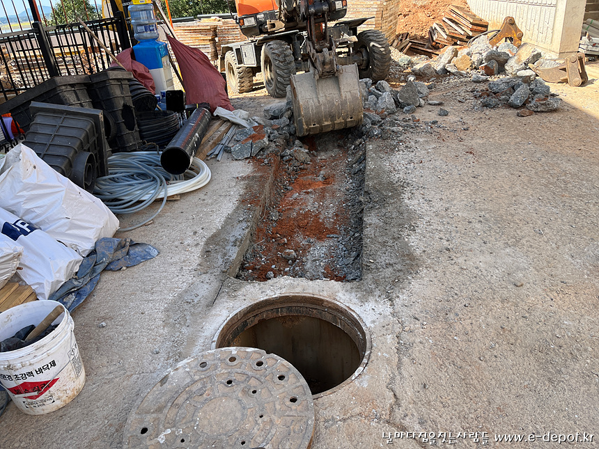 도로쪽 최종맨홀에서 해당 부지로 우수관 연결을 위해 터파기를 하는 사진입니다.
