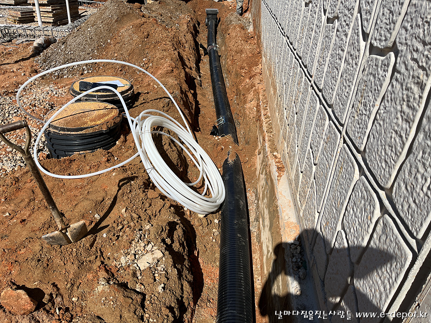 날마다집을짓는사람들의 파주전원주택시공 : 기초바닥 콘크리트 타설 후 외부배관 및 되메우기공사 과정이었습니다.