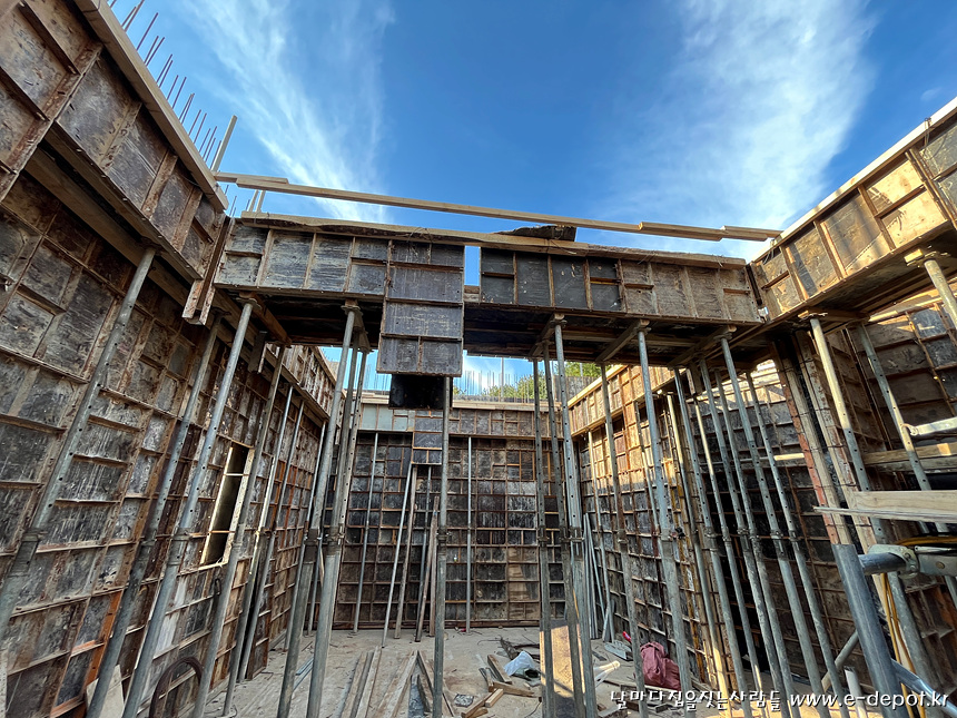 1층 스라브(2층 바닥) 거푸집이 완료된 사진입니다. 외부에 노출되는 내부 스라브는 단열재를 깔아 주도록 합니다. 스라브 단열재를 후시공하는 경우는 생략해도 됩니다.