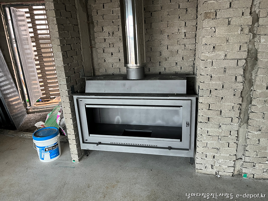 벽 매립형 벽난로이며 벽난로 주변은 먹선에 맞춰서 시멘트벽돌로 막을 예정입니다.