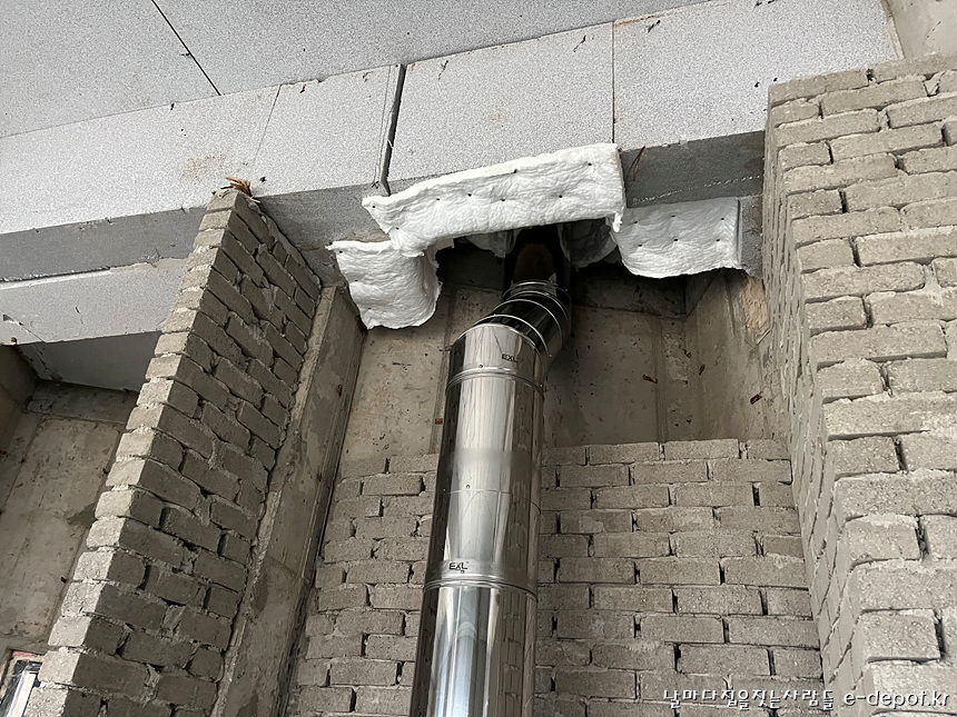 지붕 굴뚝 방수턱 외부에 시멘트 벽돌로 사각 굴뚝 쌓기.