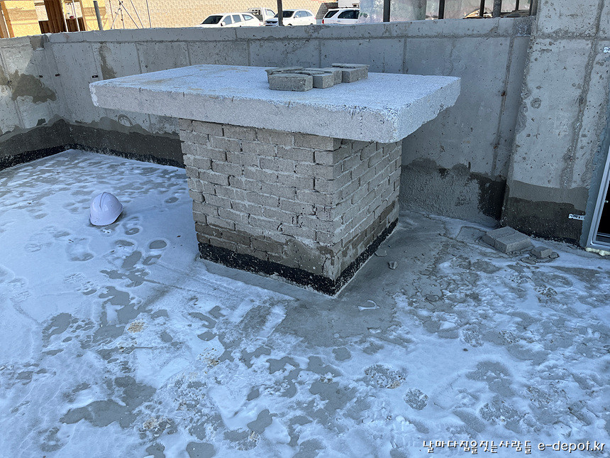 지붕 굴뚝 방수턱 외부에 시멘트 벽돌로 사각 굴뚝 쌓기.