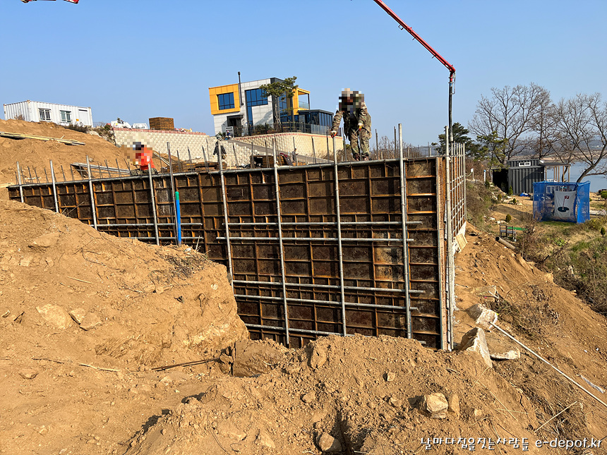 연천 풀빌라 펜션 신축사례 : 옹벽 야기리설치 및 콘크리트 타설 후 야기리 해체까지의 과정