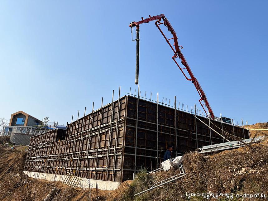 날마다집을짓는사람들의 연천 풀빌라 펜션 신축사례 : 옹벽 야기리설치 및 콘크리트 타설 후 야기리 해체까지의 과정이었습니다.