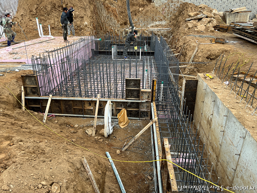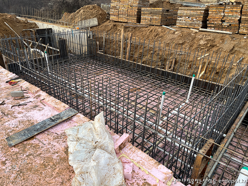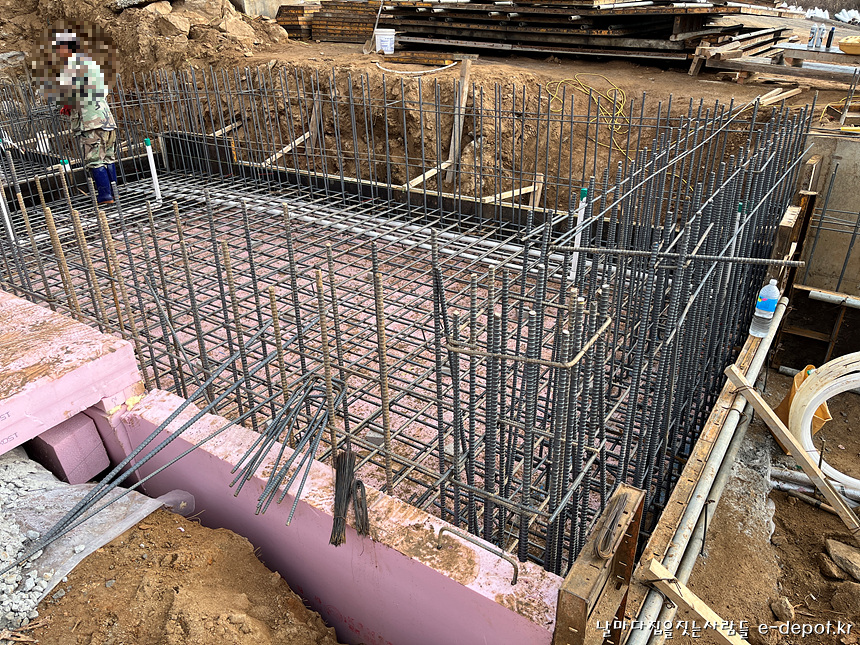 기초 단열재 깔고 철근배근하는 장면입니다.