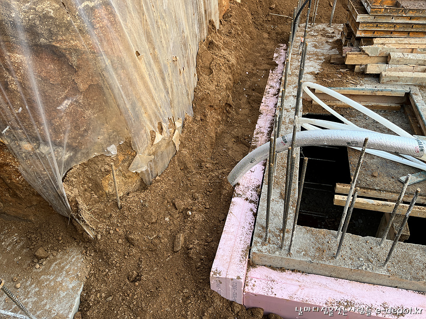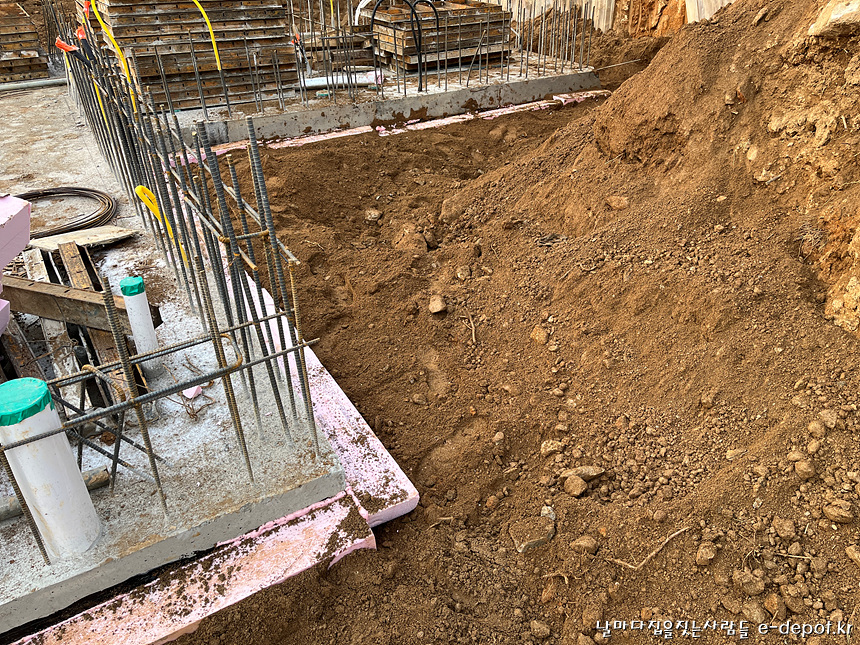 되메우기작업시 주의할 점이라면 이번 현장의 경우 외부 매립되는 부분에 시트방수를 하고 단열재를 붙인상태라 되메우기하면서 방수층이나 단열재가 파손되지 않도록 주의를 기울여 흙을 메꿔야 하겠습니다.
