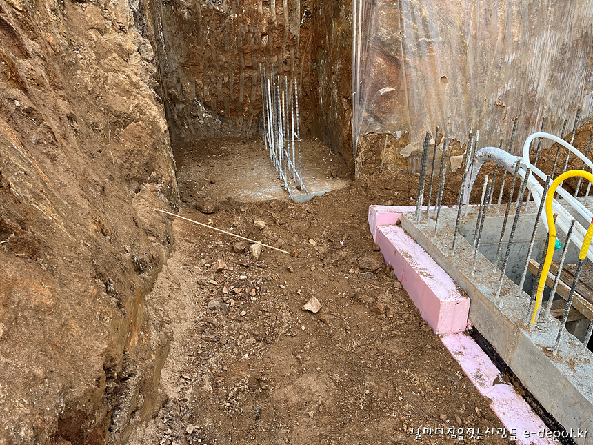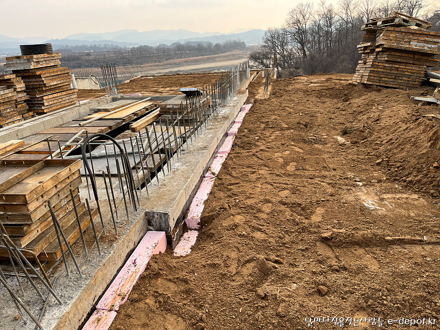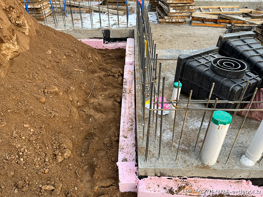 거푸집작업등을 고려하여 1층 바닥선에서 200~300mm정도 단열재를 낮춰 시공하였습니다.