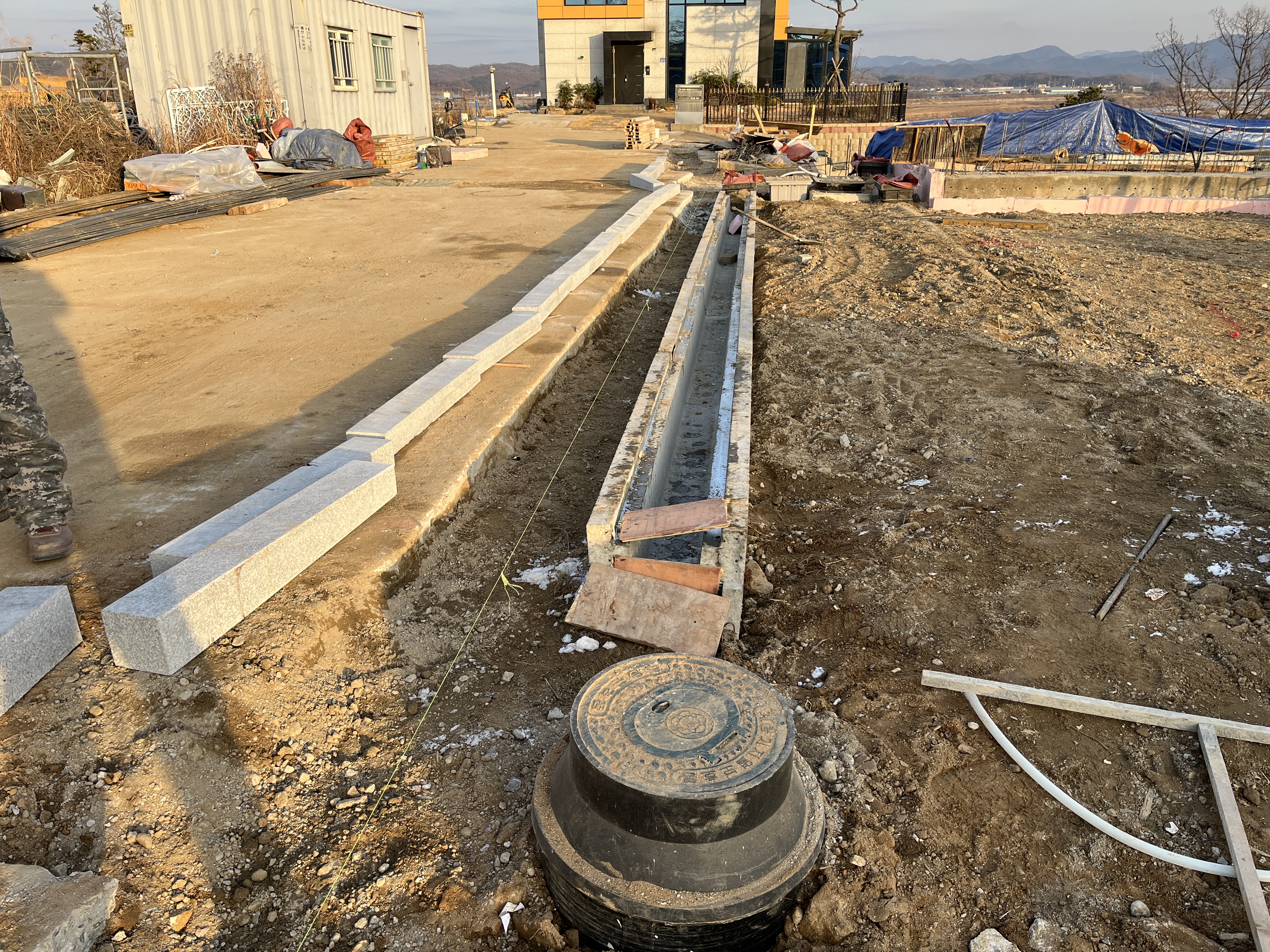 주차장 콘크리트타설을 위해 수로관매립을 하고 경계석시공을 하는것으로 오늘 작업은 마무리 합니다.