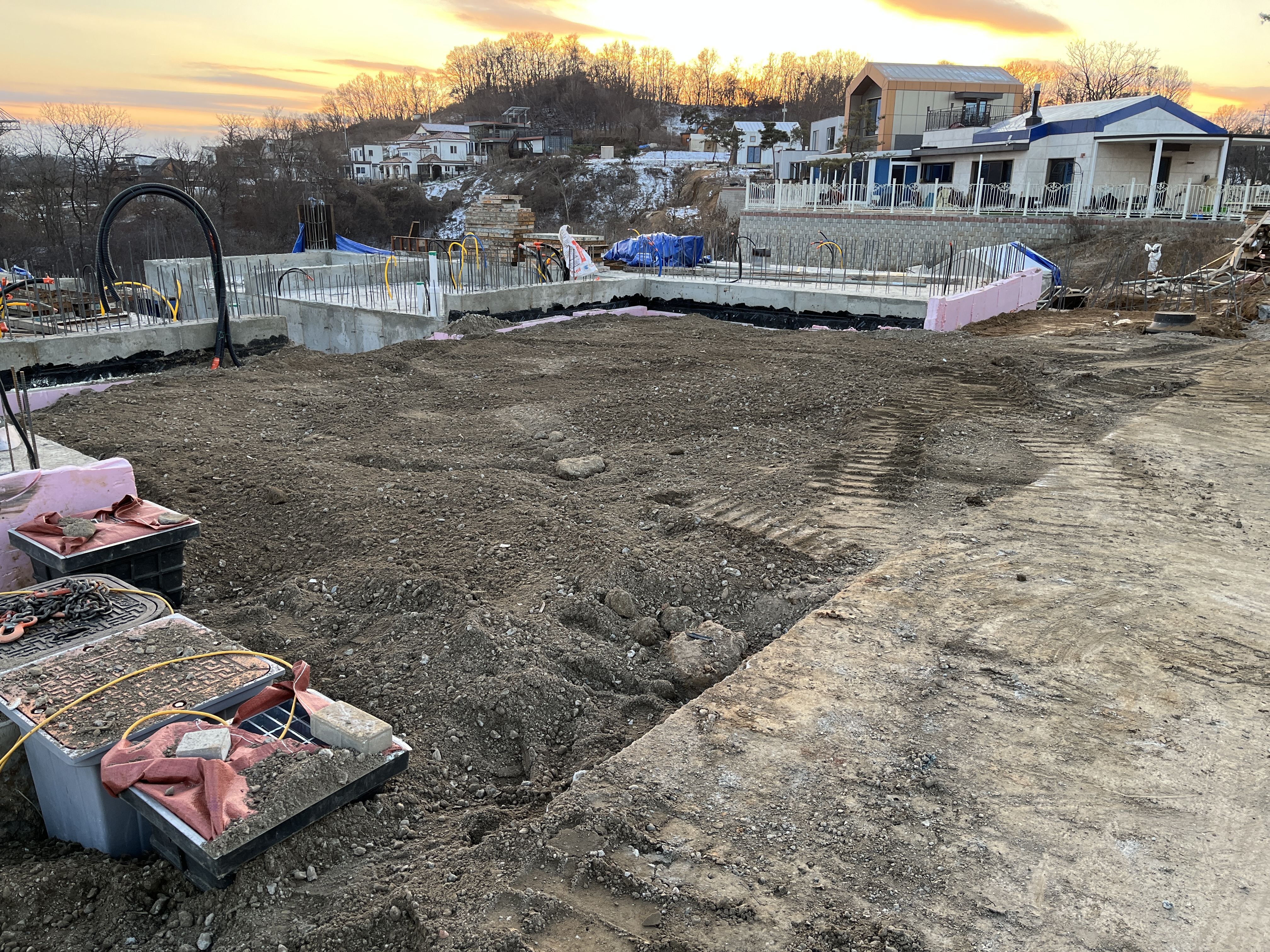 날마다집을짓는사람들의 연천 풀빌라펜션 신축현장 외부배관 및 되메우기 작업 과정이었습니다.