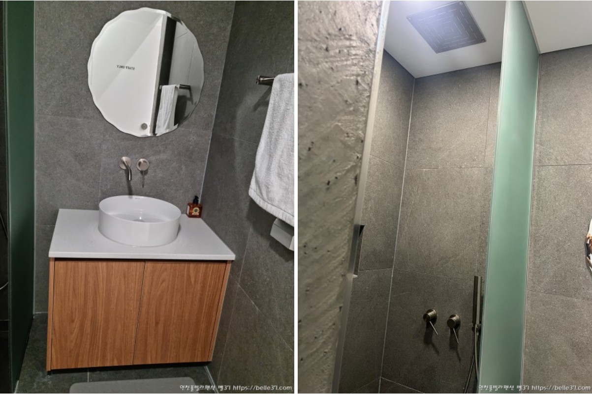 1층 세면실과 샤워실은 나란히 붙어 있으며, 샤워실은 천정 매립형 레인샤워기