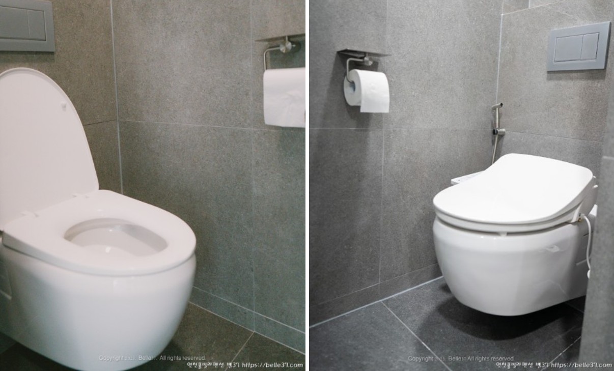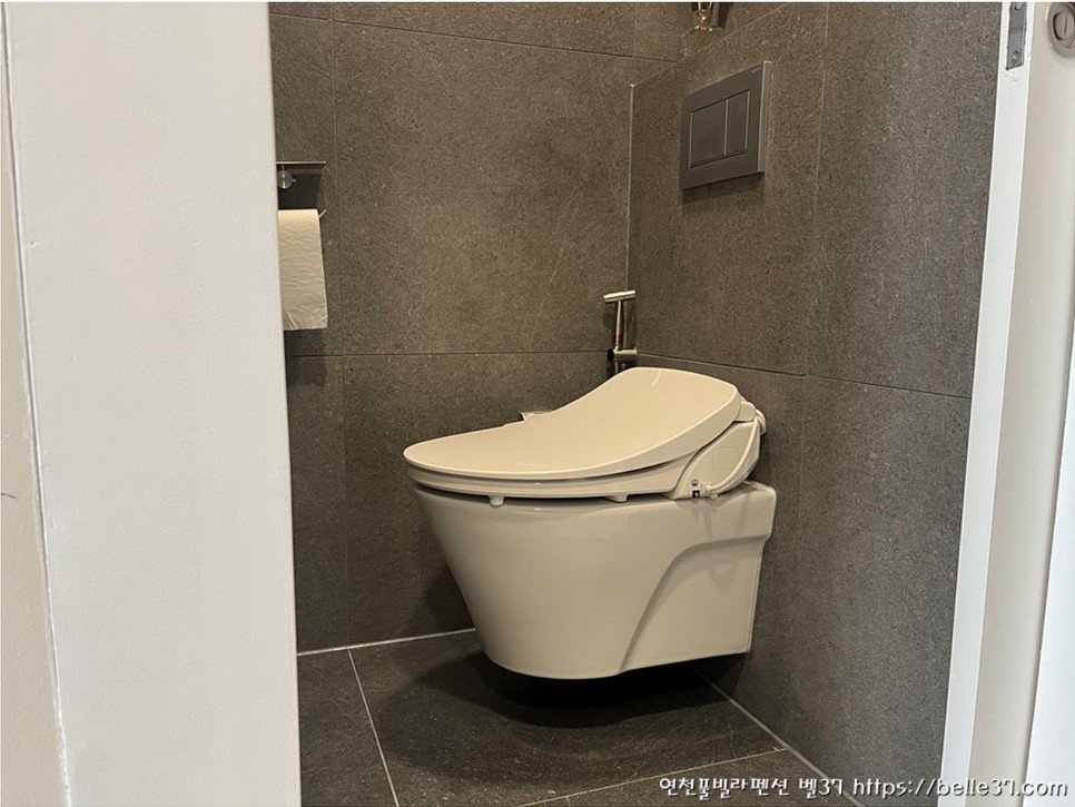 연천 풀빌라펜션 벨37은 고객들에게 조금이라도 더 쾌적한 환경을 서비스하기 위해 유럽식 벽걸이 양변기를 설치하였습니다. 2층 게베릭 벽걸이형 양변기 설치